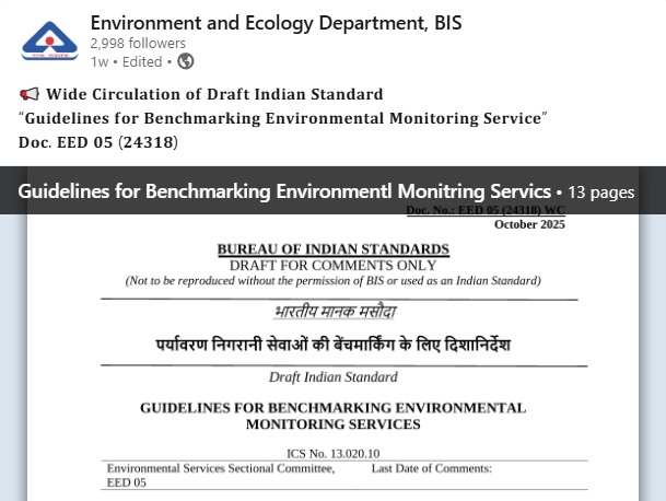 The Bureau of Indian Standards (BIS) has released a draft guideline that sets national criteria for comparing and improving the performance of organizations that monitor air, water, soil, and waste quality.