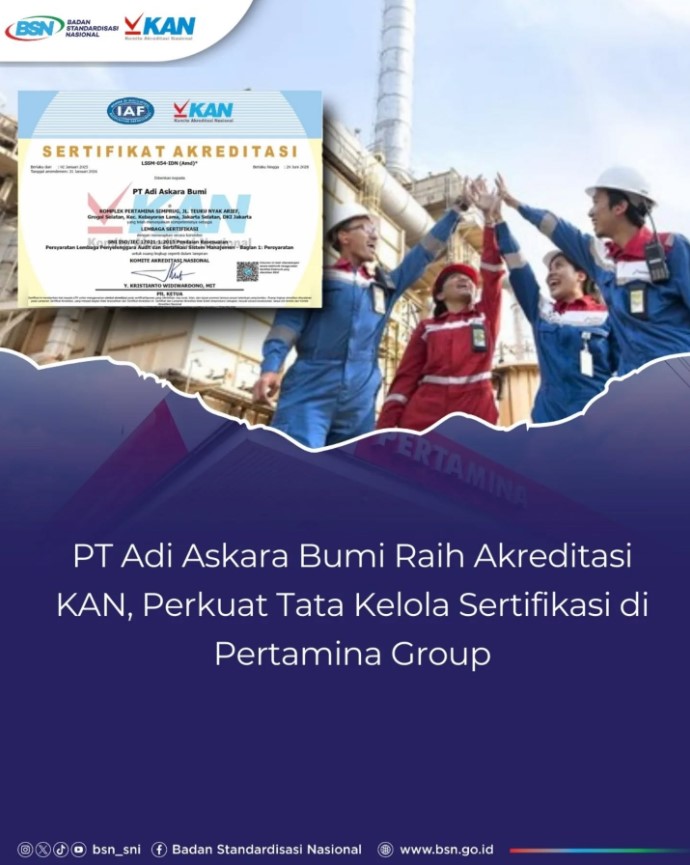 PT Adi Askara Bumi, the internal certification body of the Pertamina Group, Indonesia’s state-owned energy company, has been accredited as a Man. Sys. Certification Body by the National Accreditation Committee (KAN).