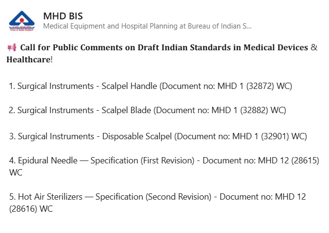 The Bureau of Indian Standards (BIS), through its Medical Equipment and Hospital Planning Department,