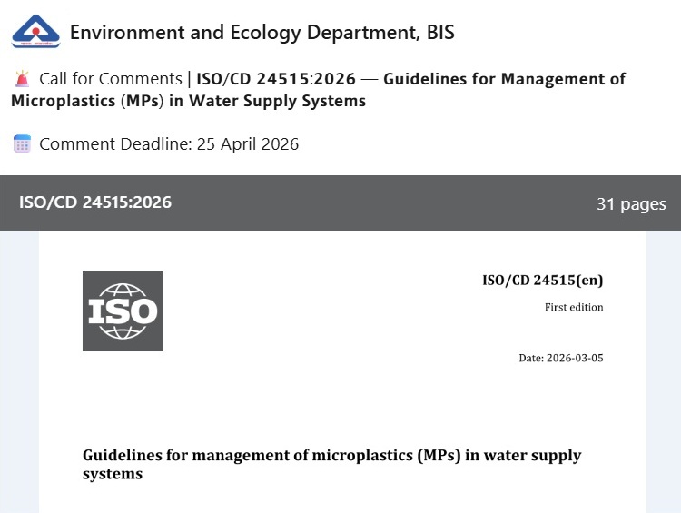 The Bureau of Indian Standards (BIS) is inviting stakeholder comments on ISO/CD 24515, a draft international standard on managing microplastics in water supply systems, with a deadline of April 25, 2026.