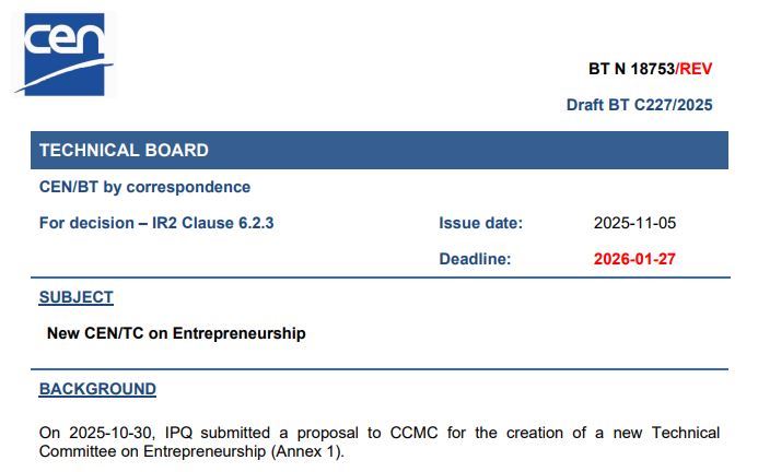 The Portuguese Institute for Quality (IPQ) has submitted a proposal to create a new Technical Committee (TC) on Entrepreneurship within CEN.